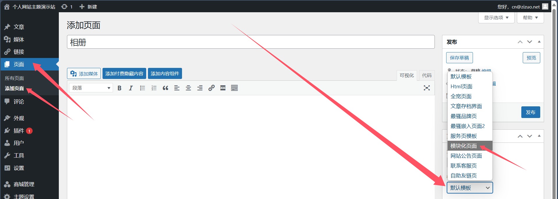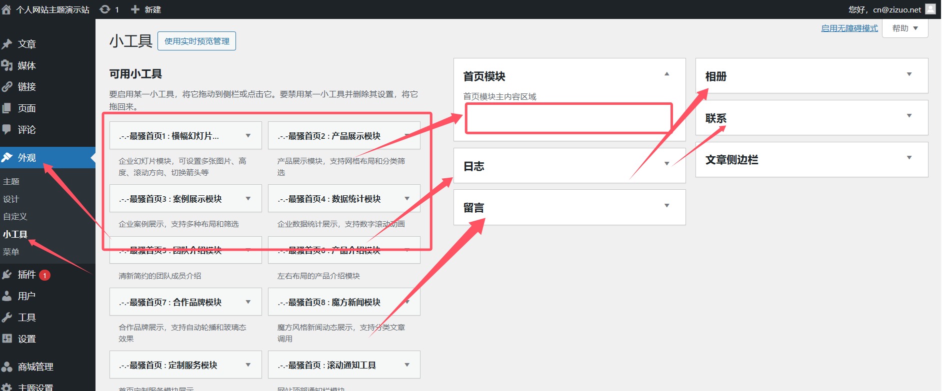 骚主题首页模块设置采用wp自带小工具体系,无缝无损无第三方依赖,高性能的自定义模块化首页,支持拖拽排序,无限复制展示。操作方法见下图 以下是小工具使用方法,将左侧页面布局小工具拖到右侧页面模块里合适位置进行布局 以下是页面新建方法。在左侧页面下面的添加页面,输入页面标题,如相册,编辑页面右侧默认模版选择模块化页面即可