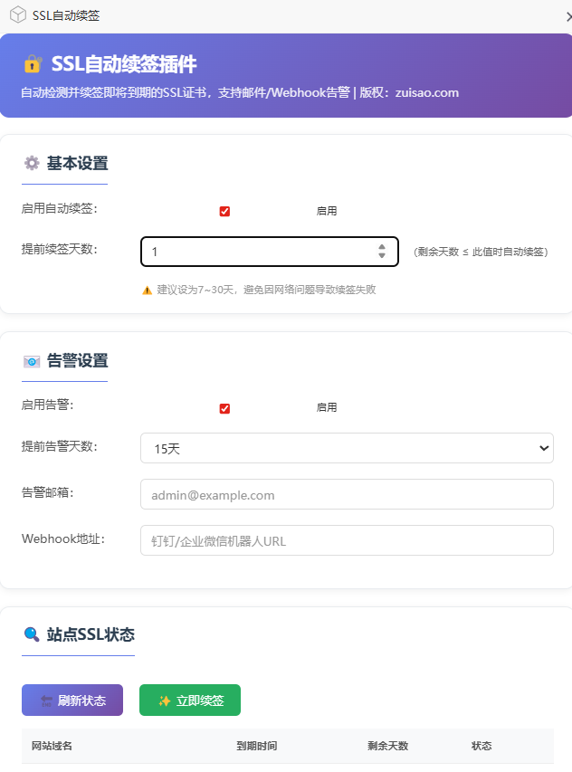 一款专为宝塔面板设计的SSL证书自动续签插件,支持到期前自动续签、多通道告警、站点状态监控。版权:**zuisao.com**
